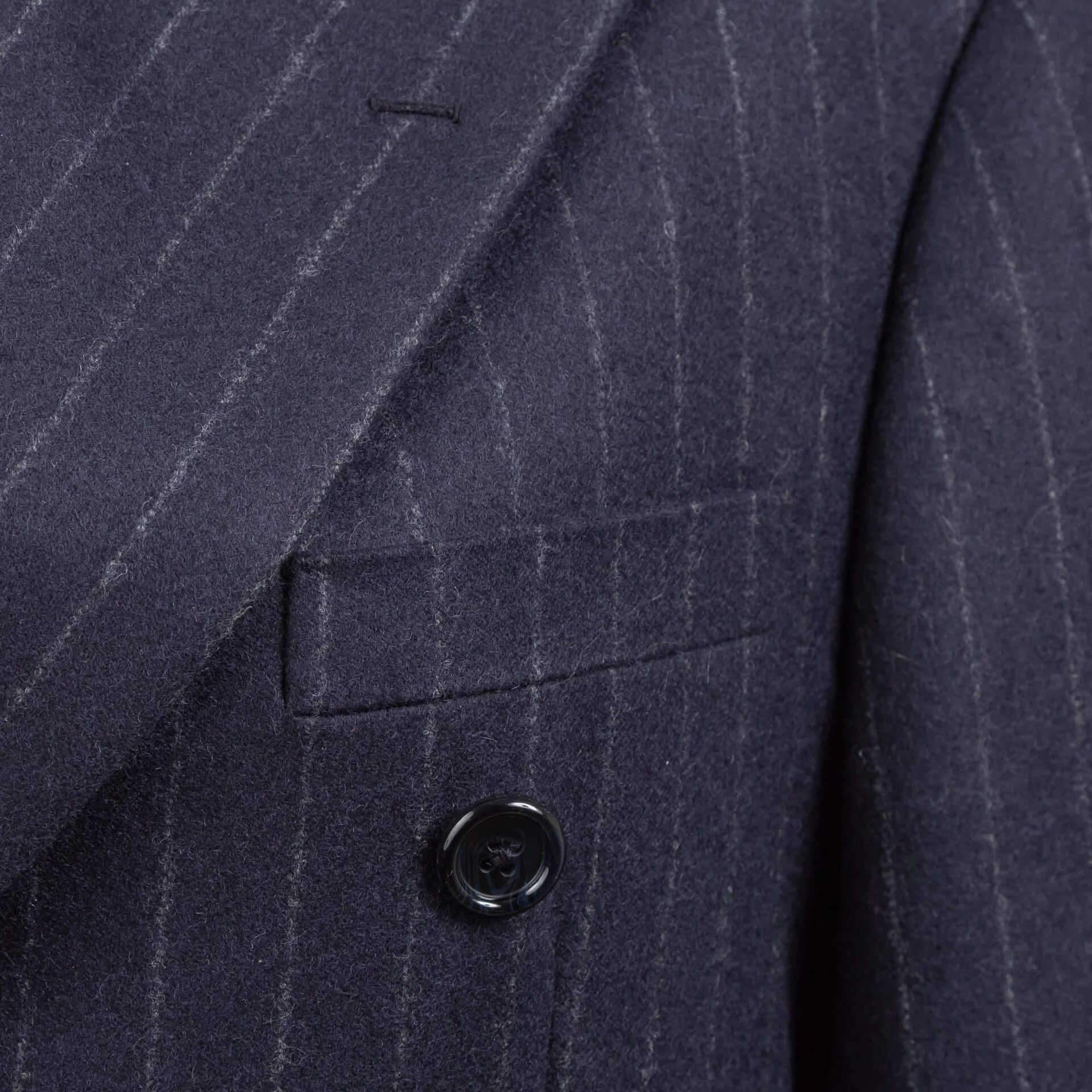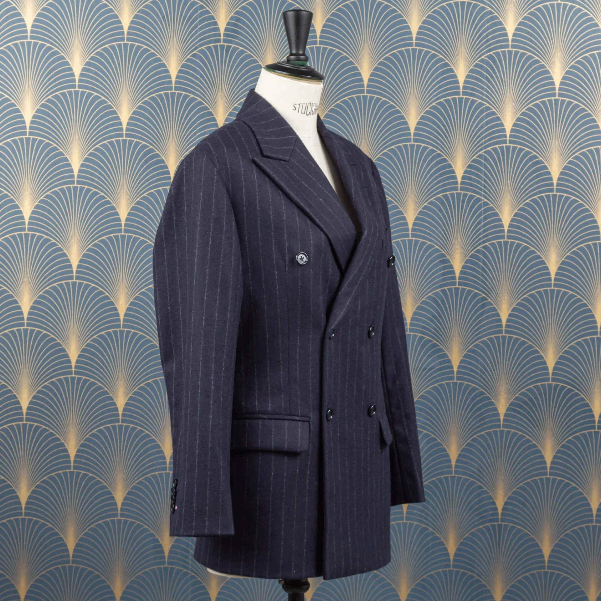 Dit krijtstreep maatpak voor dames is gemaakt met een rijke klassieke donkerblauwe wollen stof flanel met krijtstreep van Fox Brothers.