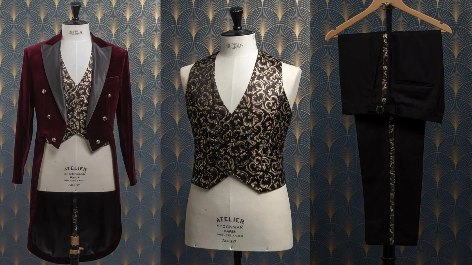 Het rokvest, dat onder de rokjas gedragen wordt, is gemaakt van een zwart jacquard stof met gouden accenten. Deze jacquard stof zorgt voor een extra laag verfijning en contrasteert mooi met de fluwelen stof van de rokjas. De subtiele glans en het gedetailleerde patroon van de jacquard stof zorgen ervoor dat het gilet een opvallend en centraal onderdeel is van de outfit.