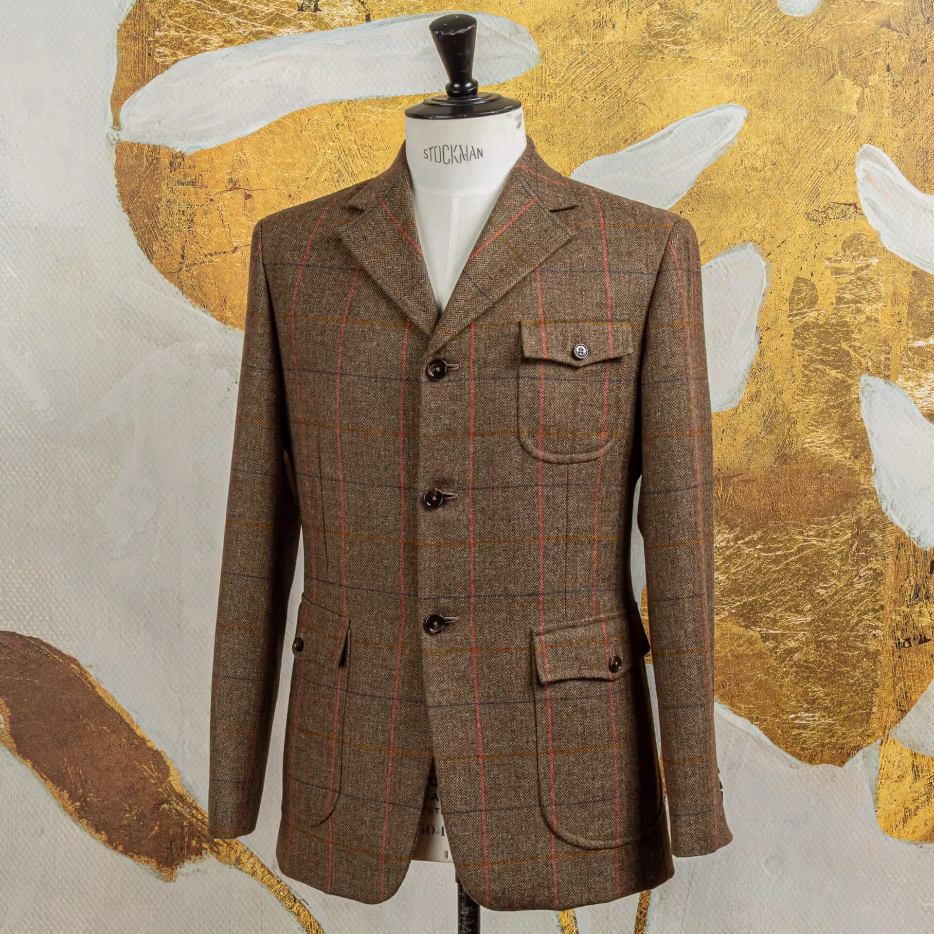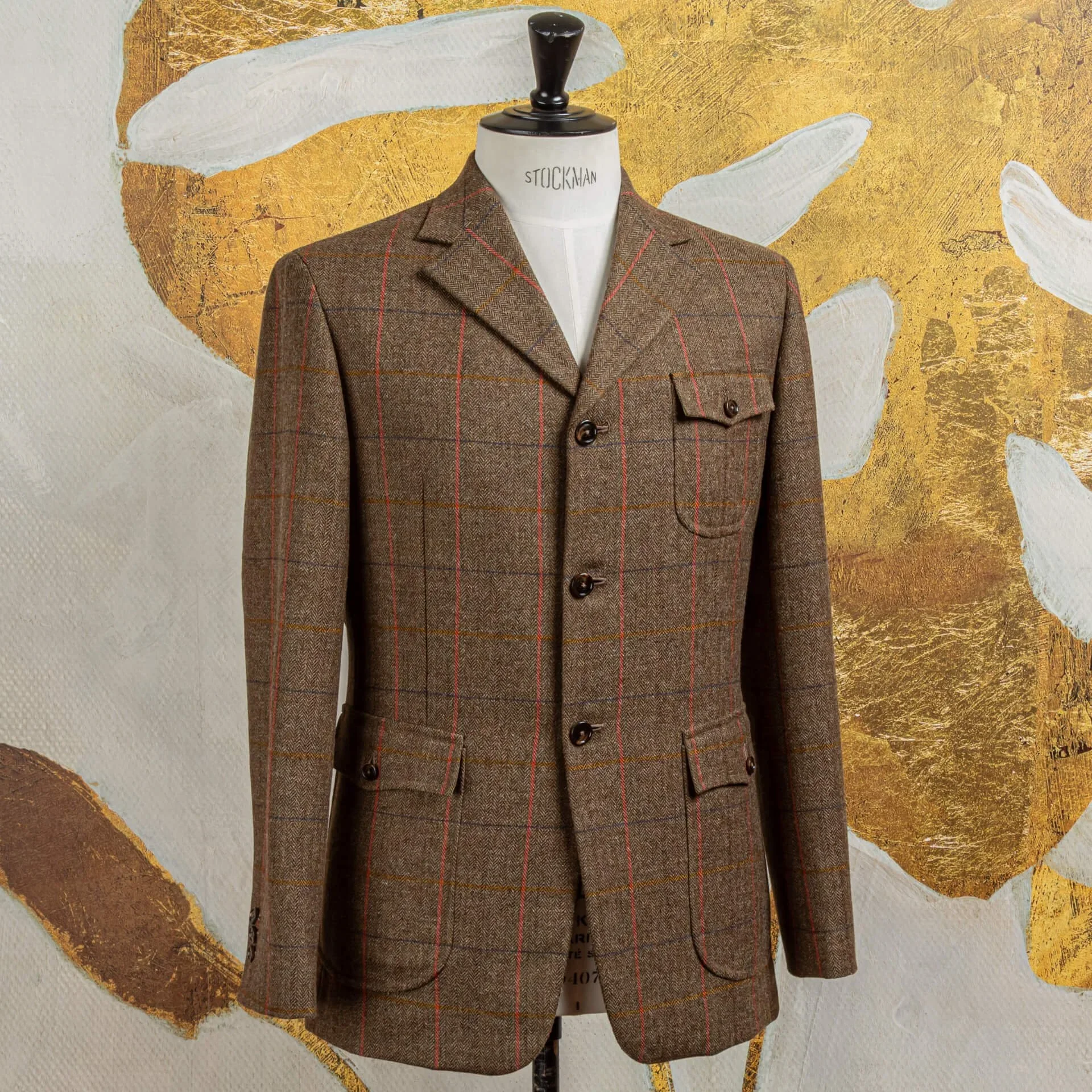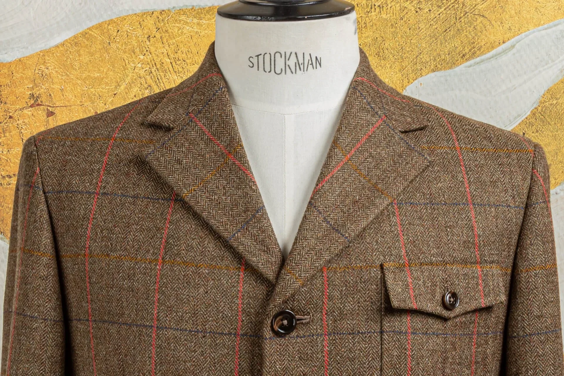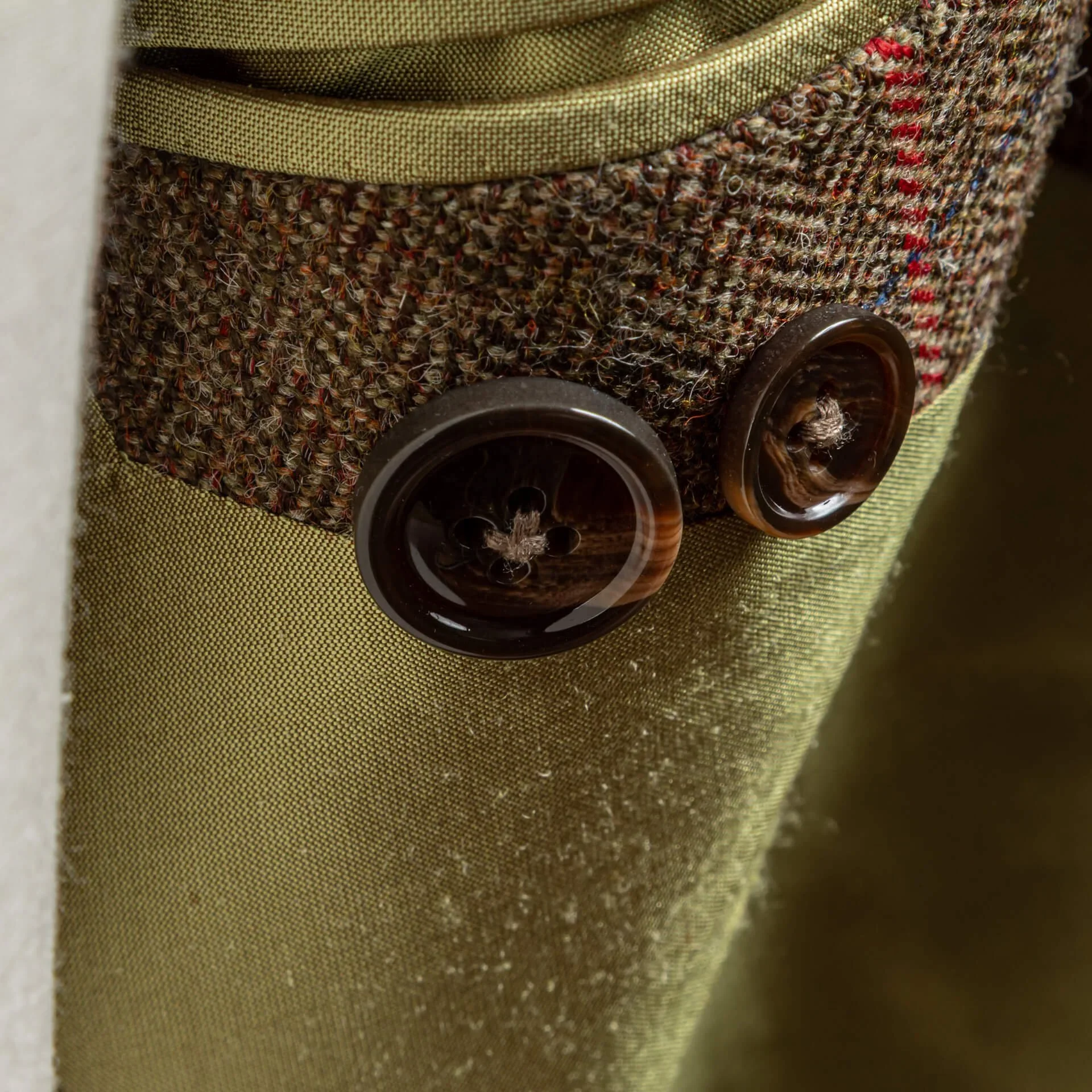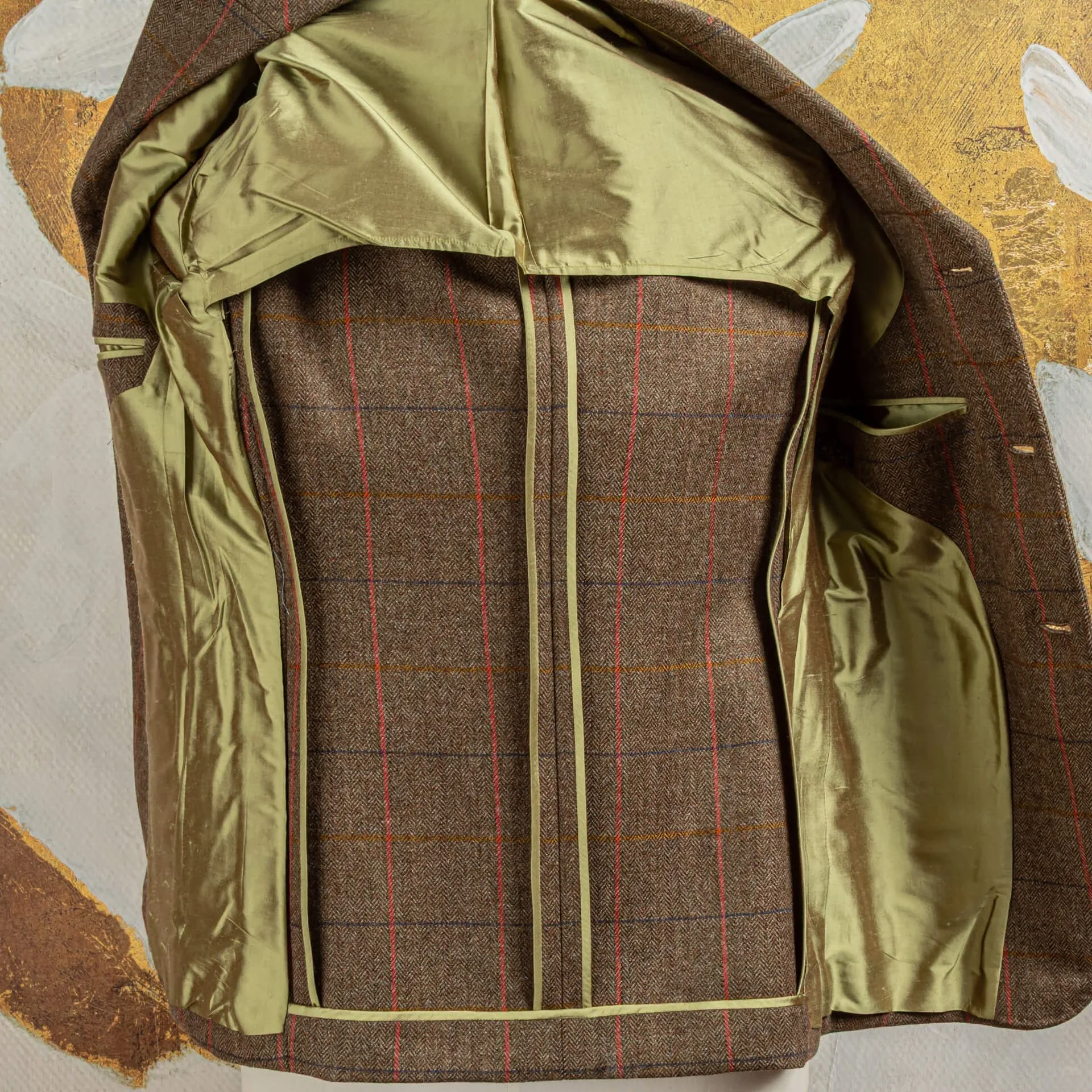 De gekozen stof uit de Glen Hunt Estate Tweed-collectie is meer dan alleen functioneel, het kleurgebruik geeft het jasje zijn karakter. De basis is een diepe mix van bruin en olijfgroen in een herringbone-weving, wat zorgt voor een natuurlijke, aardse ondertoon. Deze kleurcombinatie sluit naadloos aan bij de klassieke Britse countryside-esthetiek, maar oogt ook verrassend verfijnd in een stedelijke context.