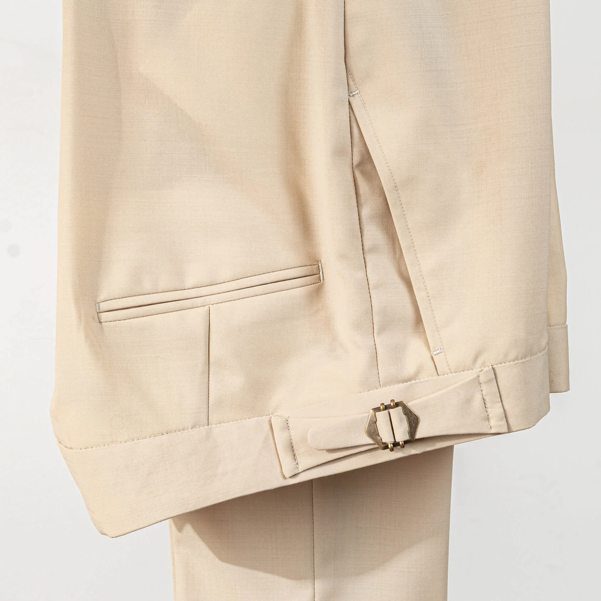 Klassieke details, zoals de rest van het pak. Side adjusters met vintage messing gespen in plaats van riemlussen. Geen riem nodig, wat een strakke lijn geeft rond de taille.