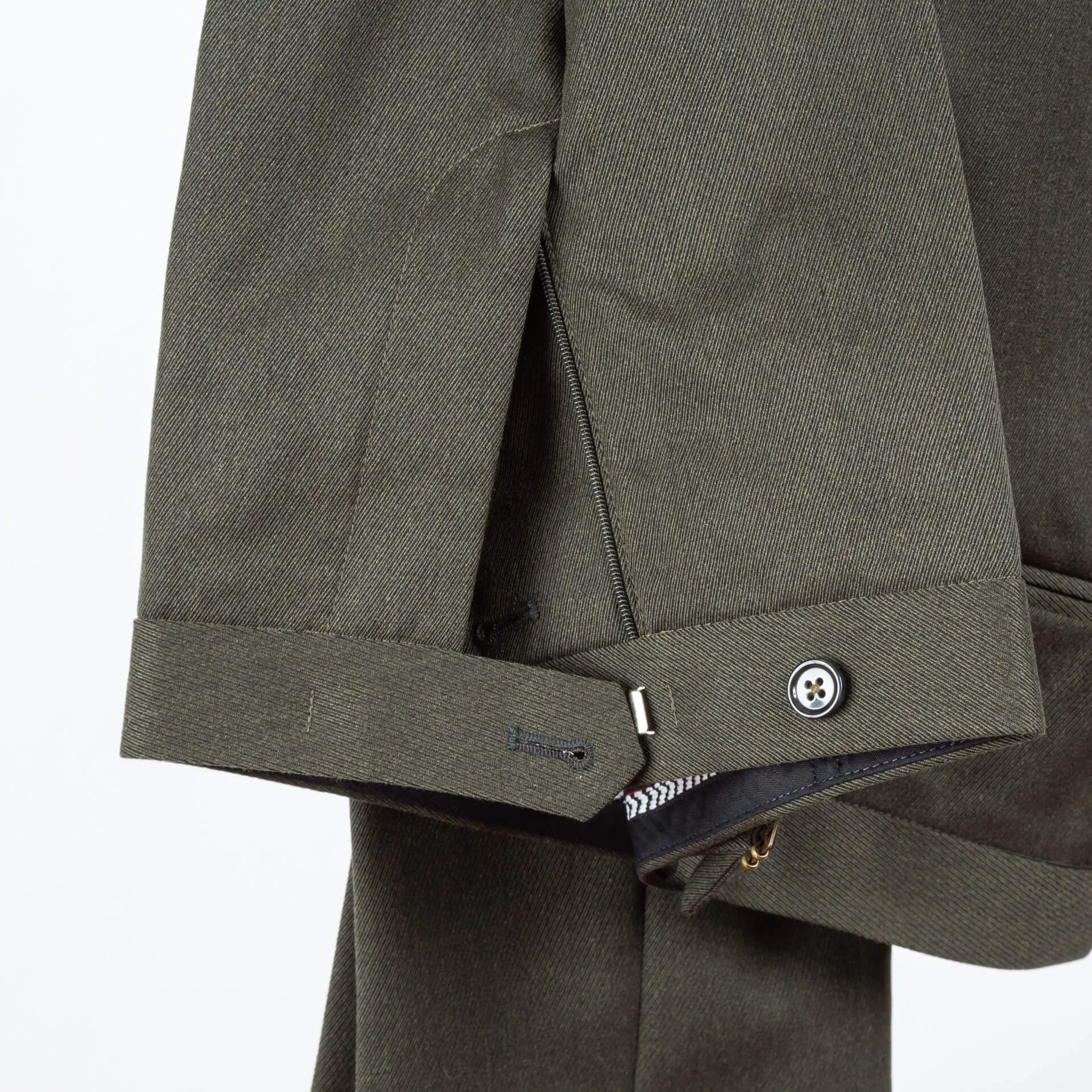De mouwen hebben vier werkende knoopsgaten (kissing buttons genoemd omdat ze elkaar bijna raken). Het onderste knoopsgat is met de hand gestikt in een subtiel blauw accent.