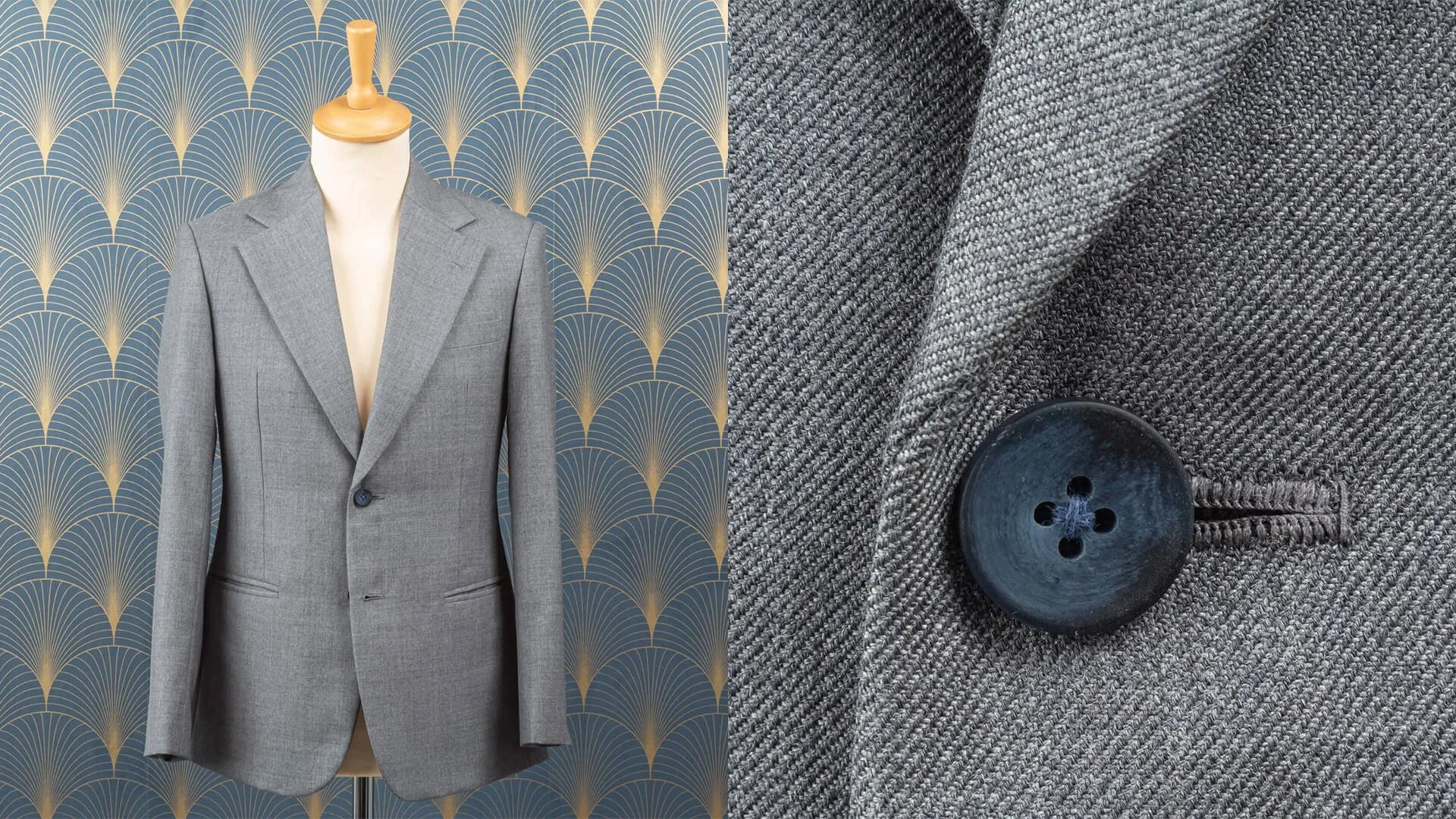 Dit is een handgemaakt 2-delig pak van wol in een lichtgrijze plain weave stof uit de Harding collectie van Bateman Ogden.