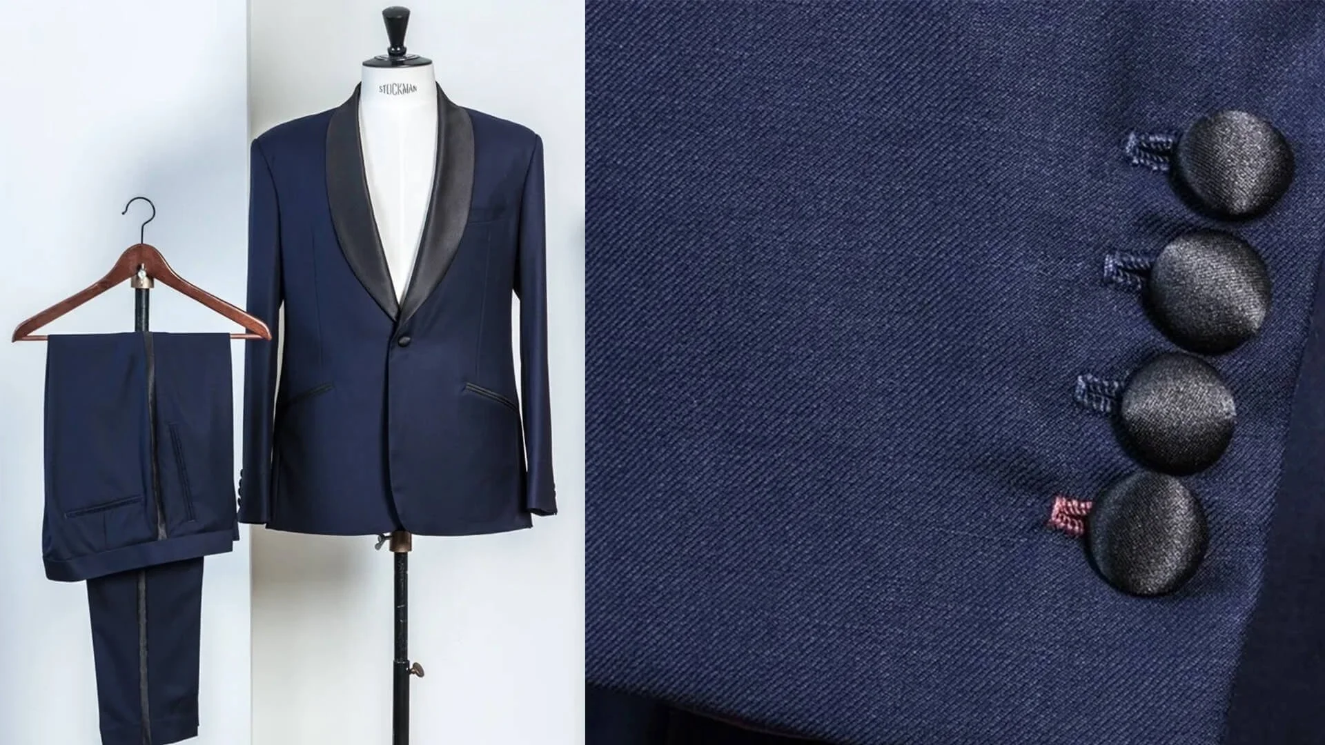 De stof betreft een donkere navy in een super 150s wol die is afgewerkt met midnight blue satijn op de revers, knopen en bies op de broek.