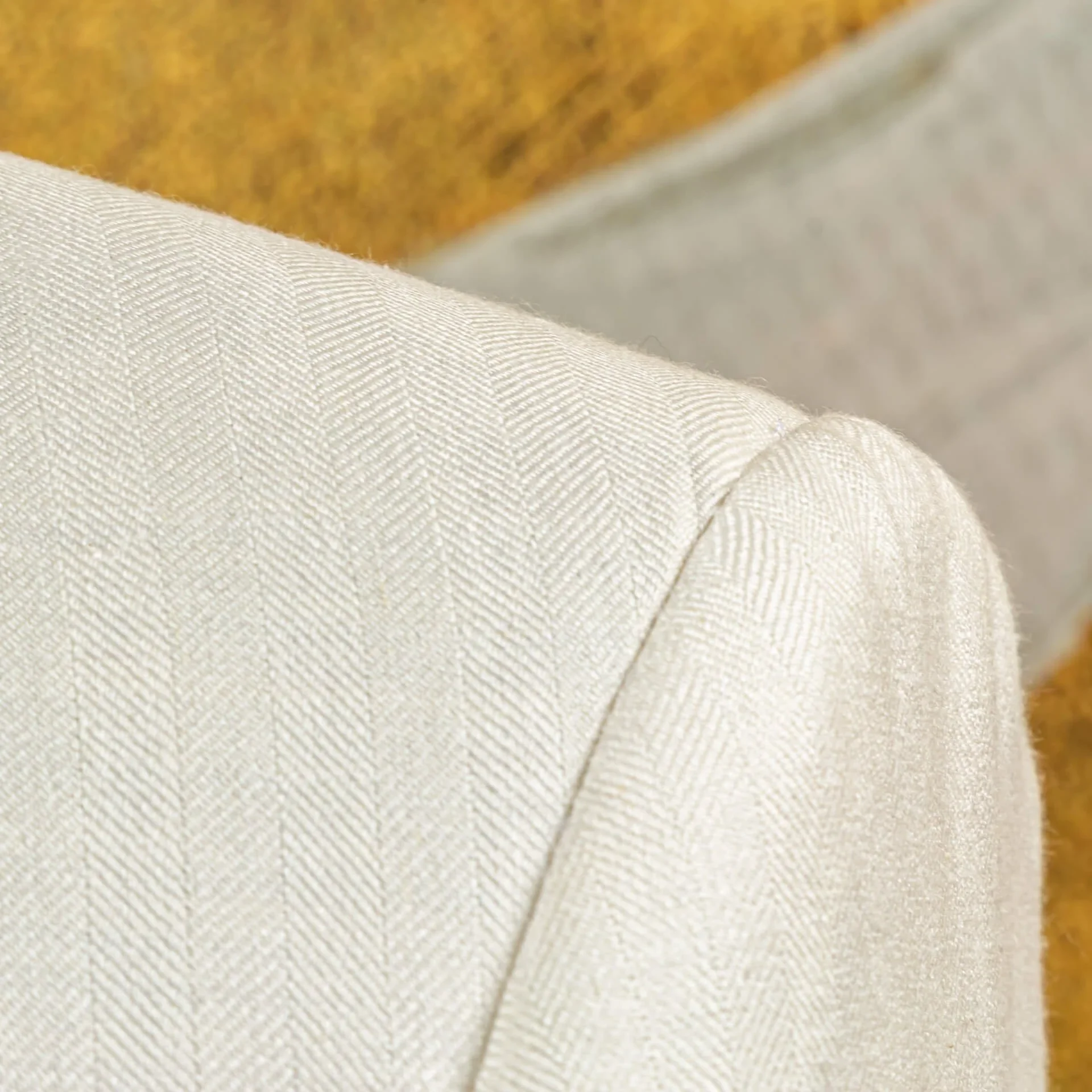 30% zijde geeft de stof zijn glans en zijn koelende werking op de huid. Zijde voelt direct koel aan bij contact, een eigenschap die in direct zonlicht merkbaar is. Tegelijkertijd voegt het raffinement toe aan het weefsel: de herringbone structuur vangt het licht op een manier die bij puur wol of puur linnen niet mogelijk is.