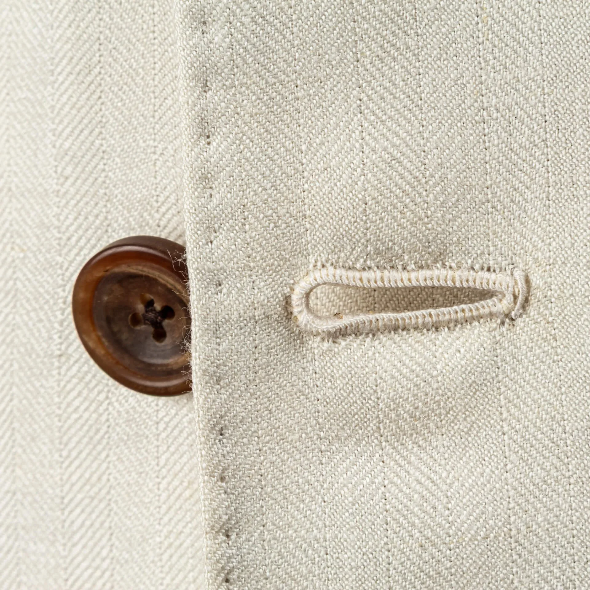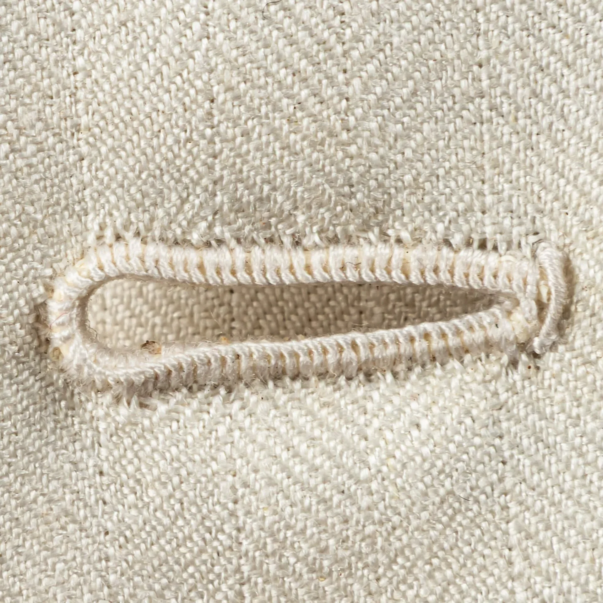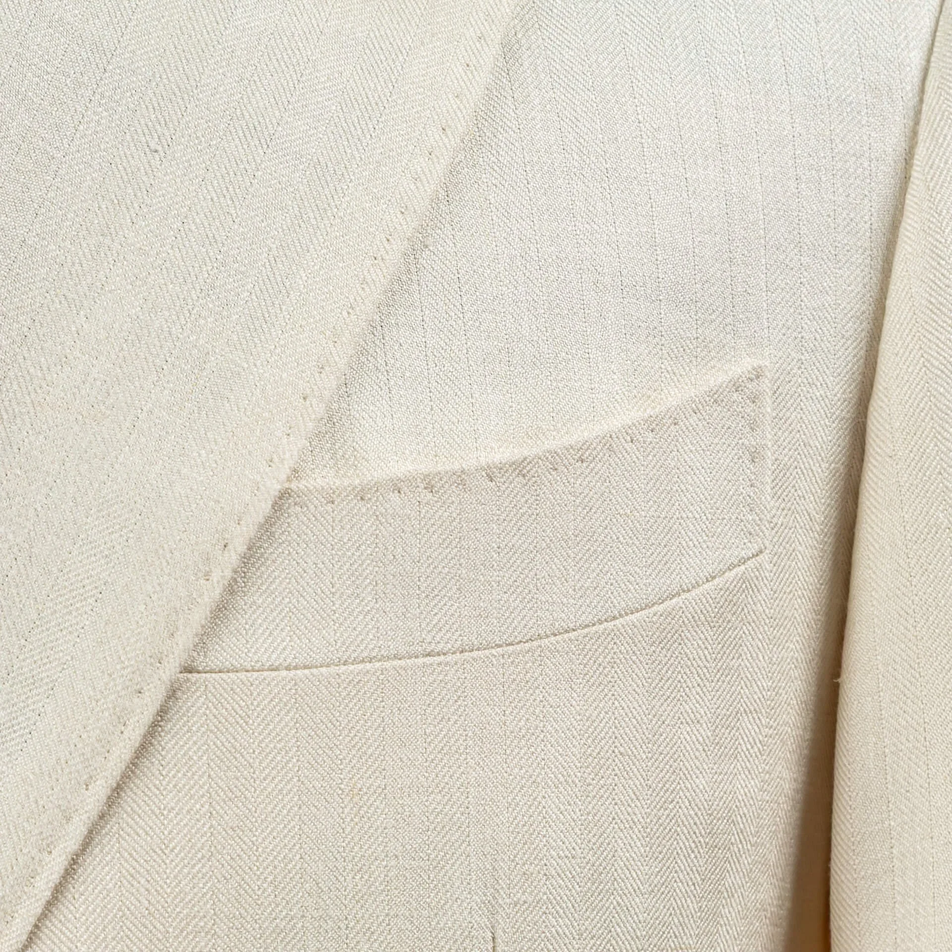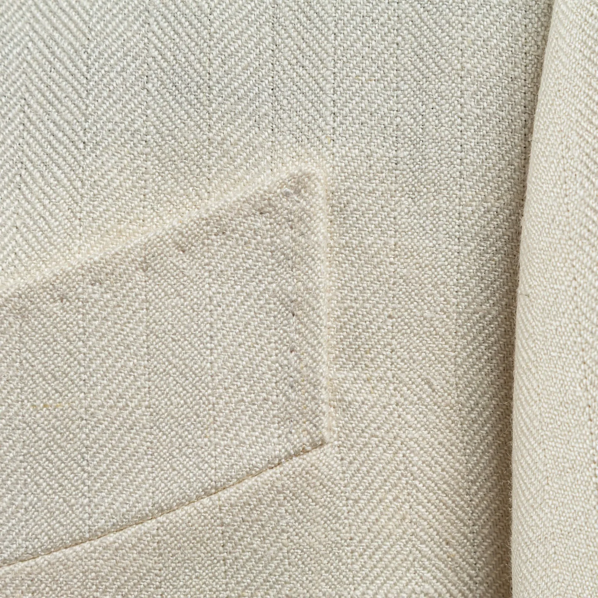 Stof die past bij de omgeving: De keuze viel op stofnummer 350142 uit de Caccioppoli Spring–Summer 2025 collectie. Een lichtgewicht herringbone van 240 gram, opgebouwd uit 49% wol, 30% zijde en 21% linnen. De wol geeft vorm en stabiliteit, de zijde koelt en geeft glans, het linnen zorgt voor luchtdoorlatendheid. Geen van de drie heeft de nadelen van een monomateriaal.