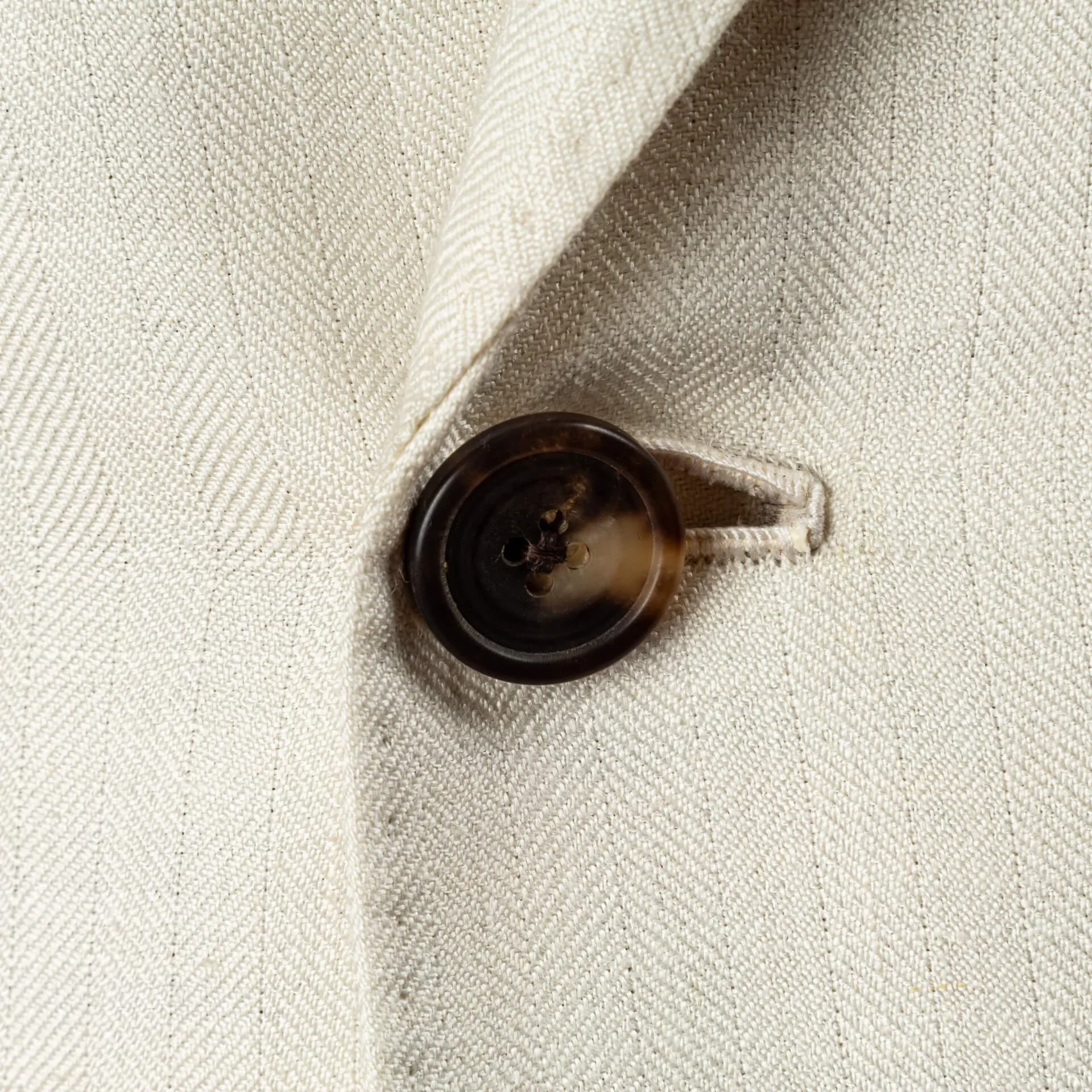Constructie die het geheel bijeenhoudt: Ook bij een lichtgewicht zomerstof kiezen we voor full canvas. Juist bij lichte stoffen is het binnenwerk bepalend voor hoe het pak valt en hoe het zijn vorm behoudt over een lange dag.