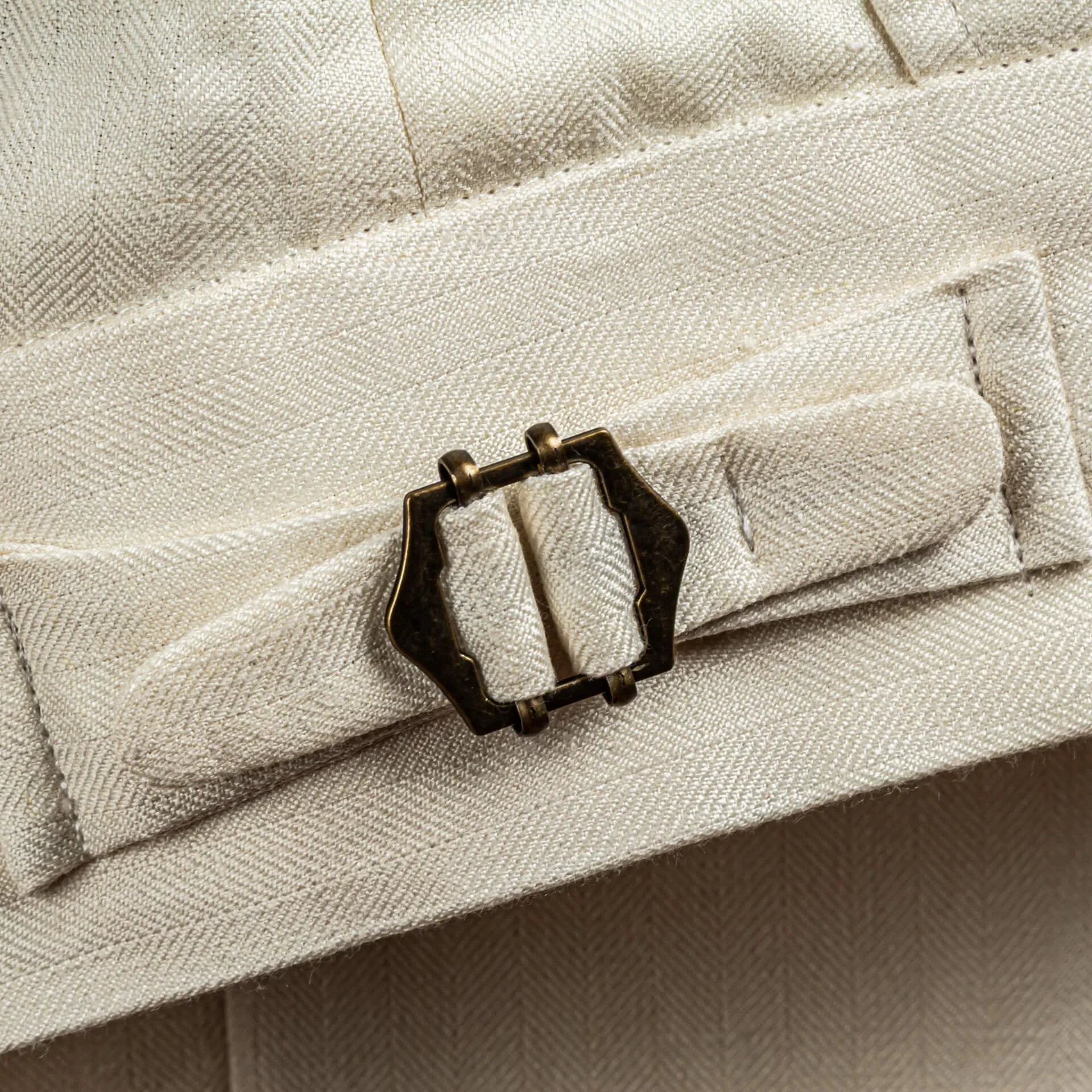 De broekband heeft side adjusters, metalen gespen aan weerszijden waarmee de wijdte naar wens wordt ingesteld. Het is een klassieke oplossing die comfortabeler is dan een riem en eleganter oogt bij een pak zonder gilet. Bij een strandhuwelijk, met een dag die begint bij de ceremonie en eindigt met een feest is dit een praktische keuze.
