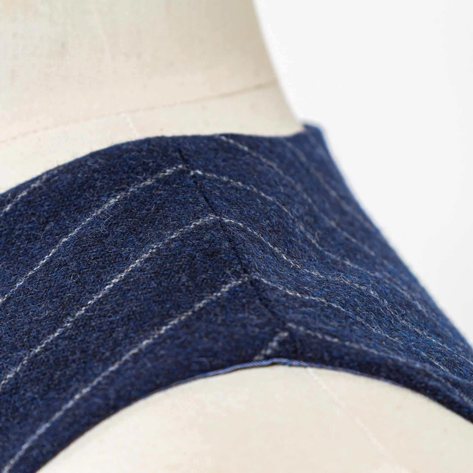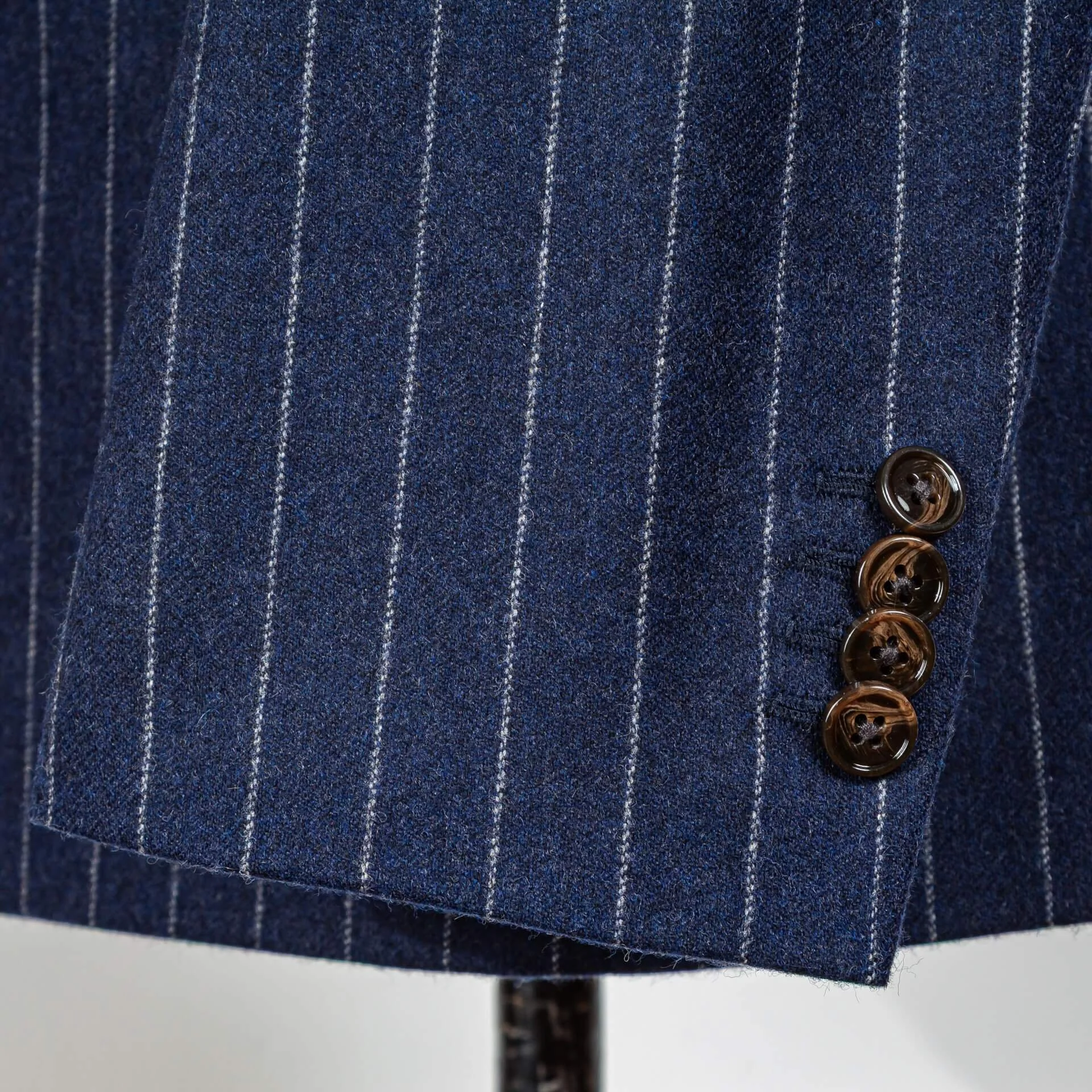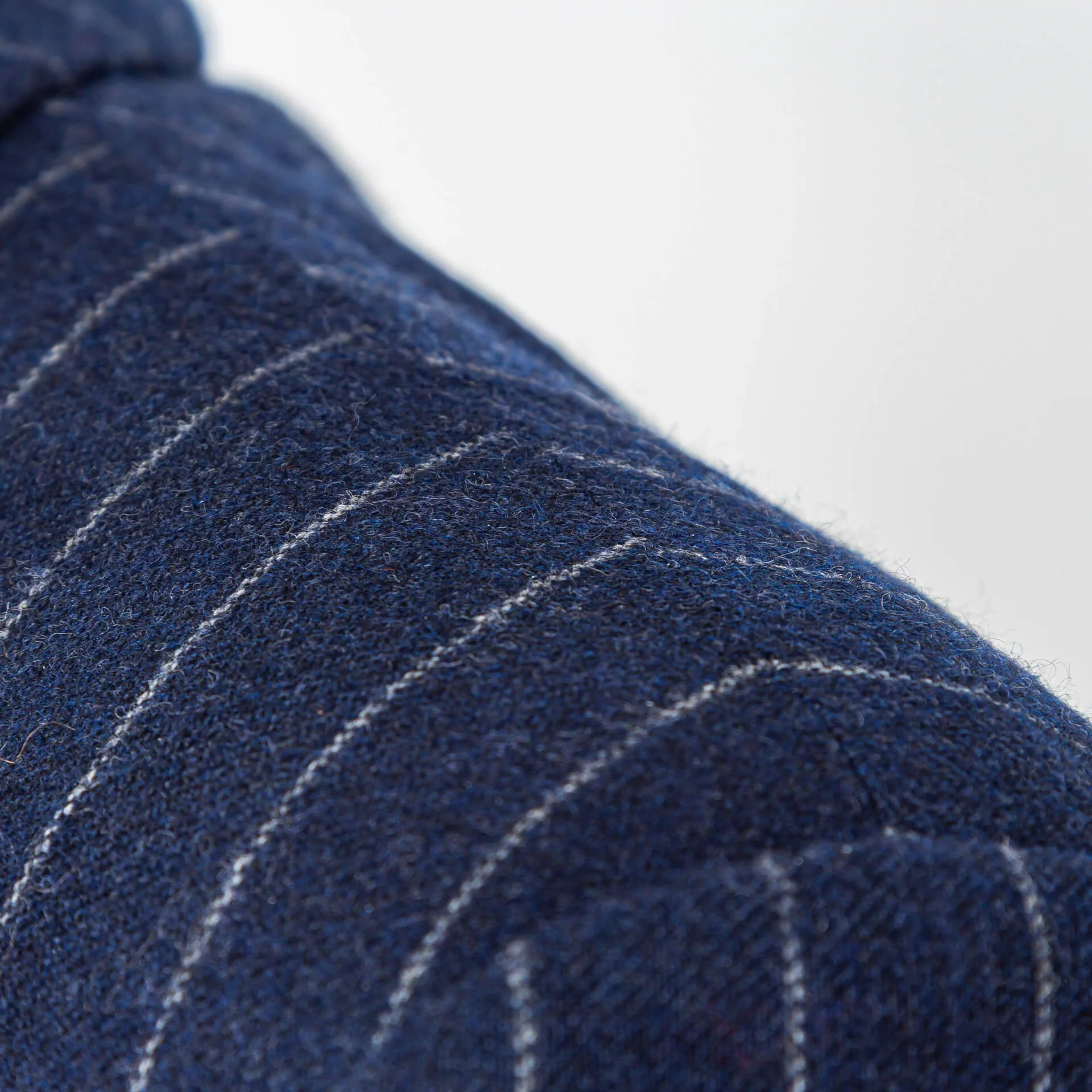 Stof als tijdmachine: Geen gladde worsted die modern en zakelijk aanvoelt, maar wol-kasjmier flanel, een stof die je associeert met de gouden eeuw van herenkleding. De 340 gram navy krijtstreep combineert de zachtheid van kasjmier met de structuur van wol, wat resulteert in een stof die soepel valt maar toch body heeft. De krijtstreep is subtiel genoeg om elegant te blijven, uitgesproken genoeg om karakter te geven. Van Holland & Sherry, een Britse stofleverancier die al sinds 1836 stoffen levert aan de beste kleermakers ter wereld.