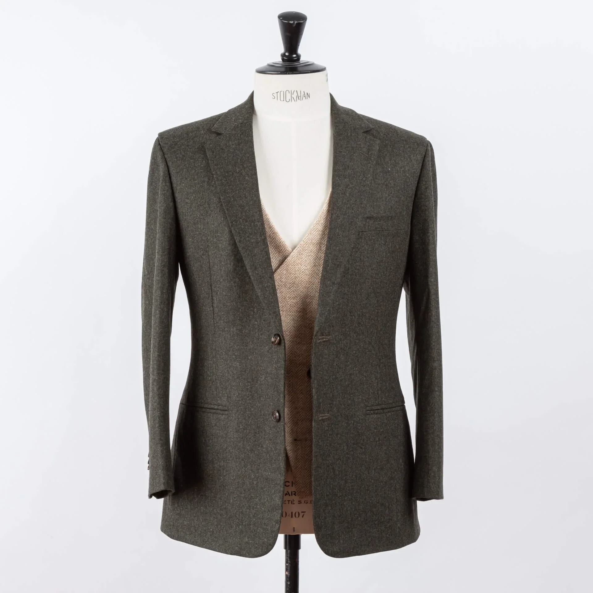 Deze outfit combineert twee Holland & Sherry stoffen: een forest green solid flannel voor colbert en broek, en een light sand herringbone uit de Sherry Tweed collectie voor het gilet. Het resultaat is een look die aansluit bij de natuur van de Pyreneeën, die vakmanschap uitstraalt zonder pretentie, en die warmte biedt op een bergtop in juni zonder te overdrijven.