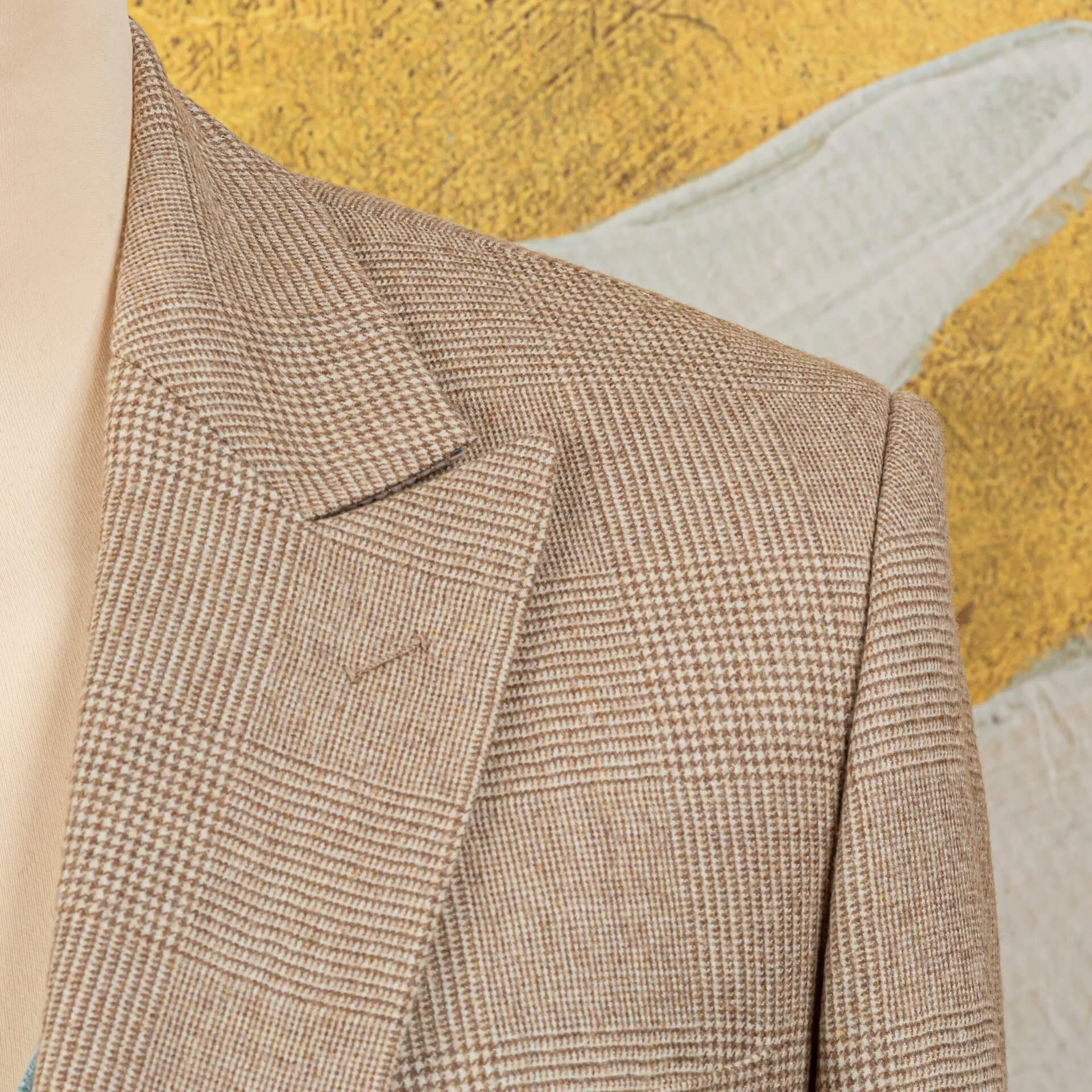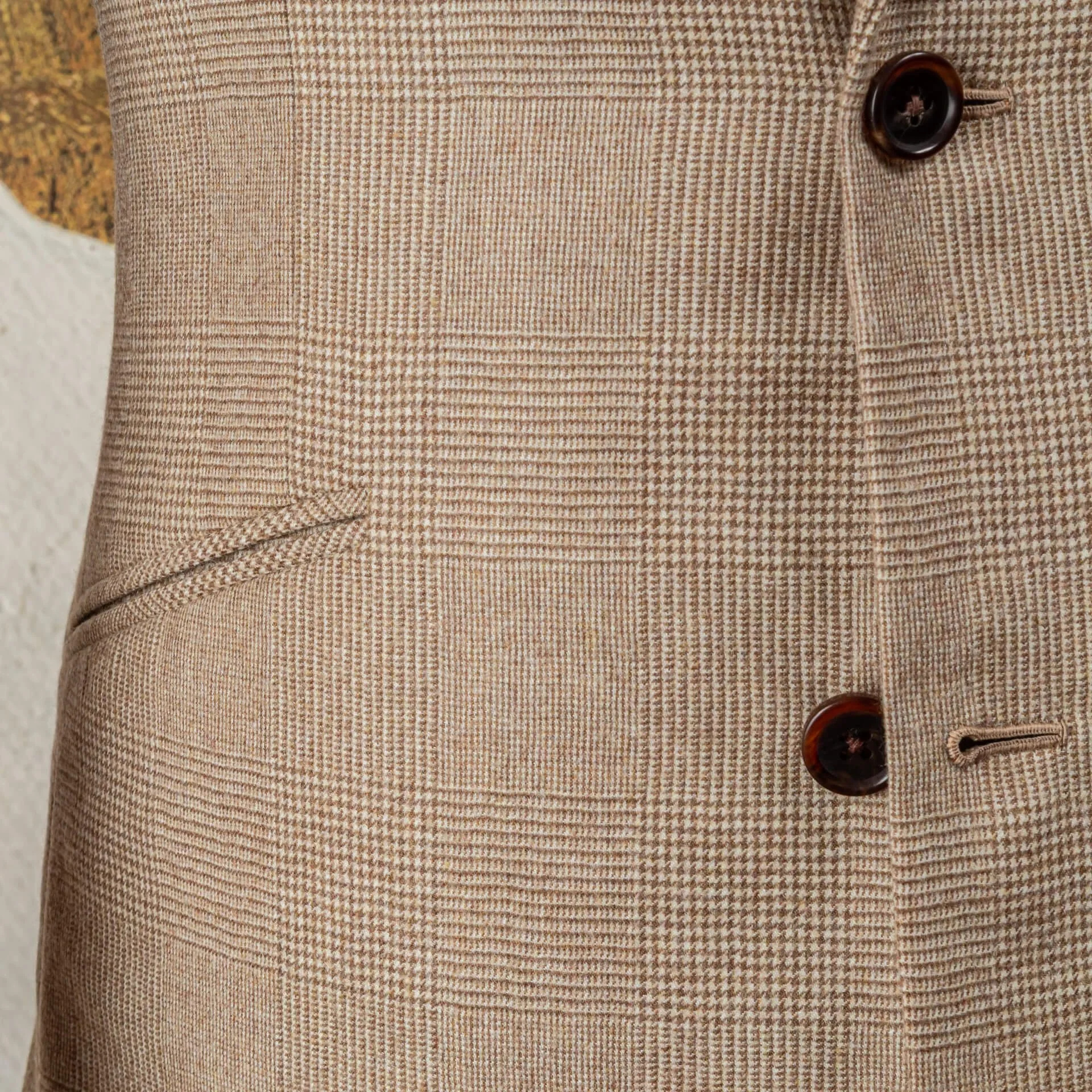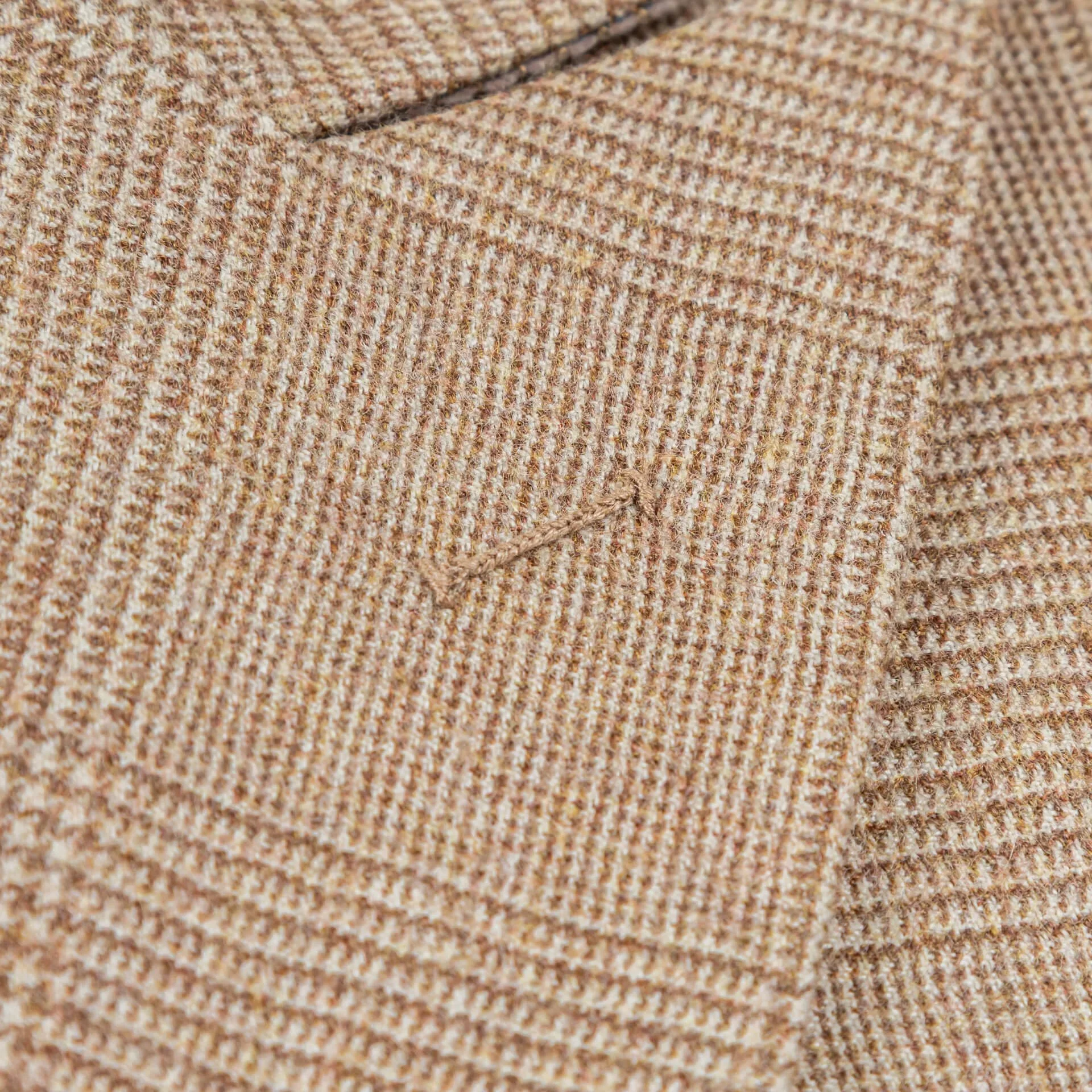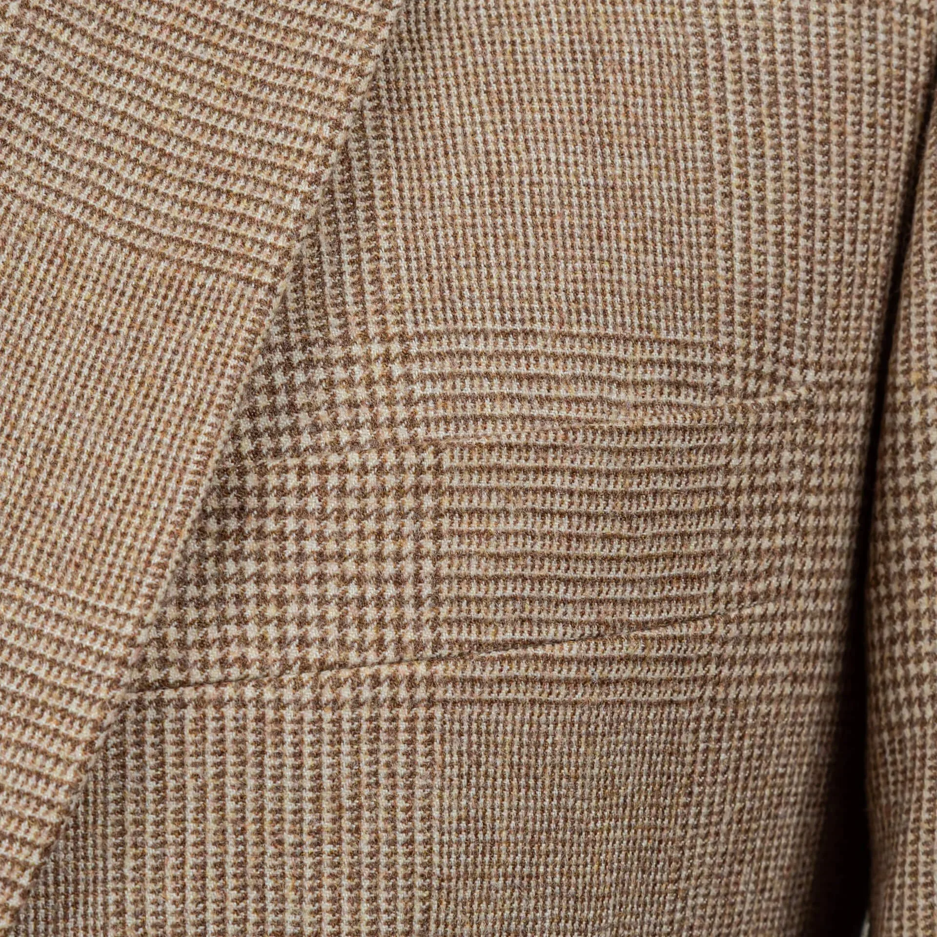 Bij dit pak zijn de camel checks zorgvuldig gematcht op alle zichtbare naden: de schoudernaden, de zakranden, de rug. Het is tijdrovend werk dat vraagt om ervaring en geduld, het soort werk dat je onderscheidt van confectie waar ruiten zelden doorlopen.